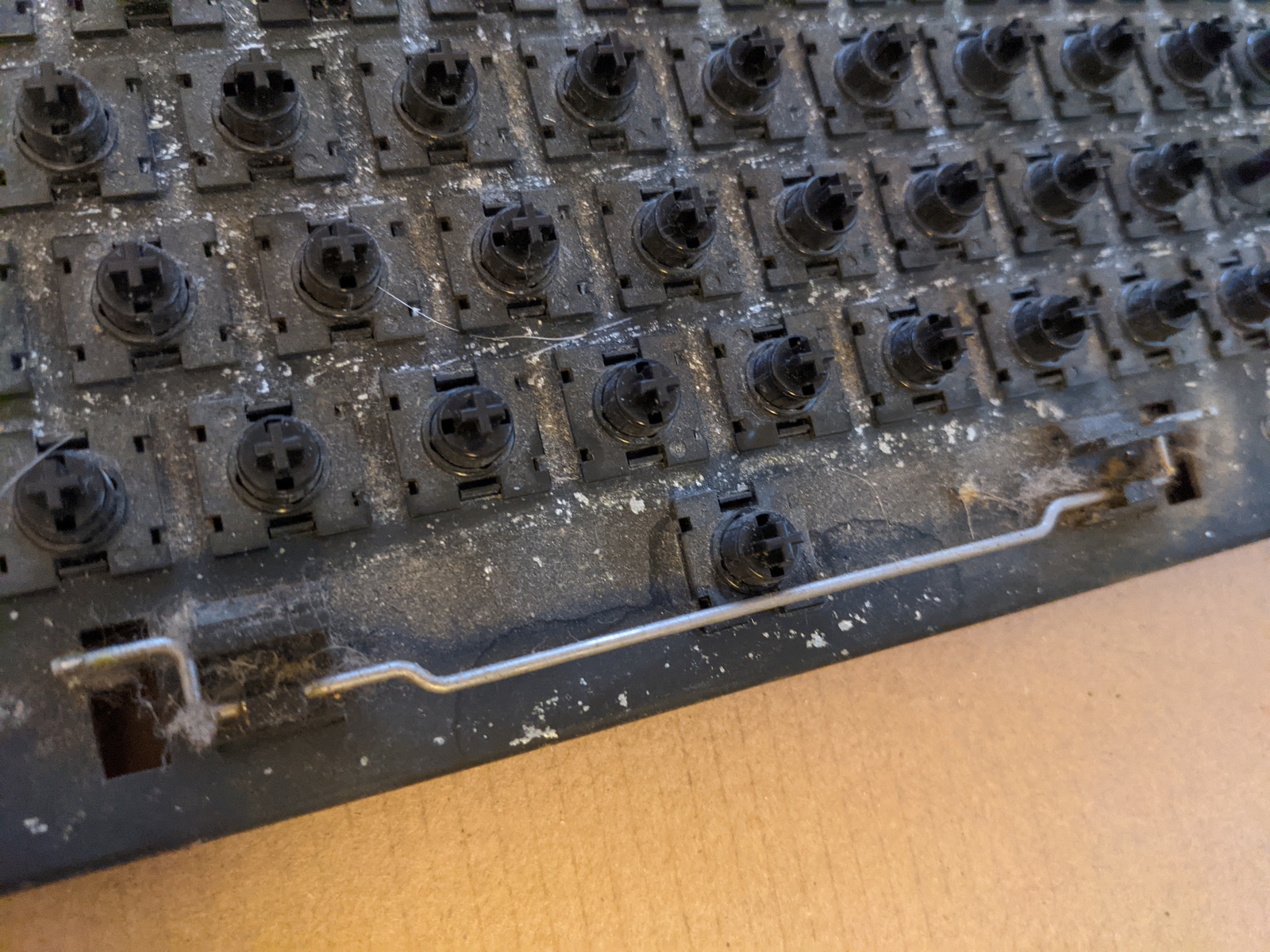 I washed al of the plastic components with warm soapy water. After everything dried, I noticed right away that the conductive parts of the key switch body on almost all the switches were severely tarnished. I used a bunch of Q-Tips with some fine steel wool to polish up the contact points inside of the body. I then took some resistance measurements with my multimeter and found that there was still no positive contact between the carbon contact and the contacts in the switch body for the majority of the switches I tested this way.